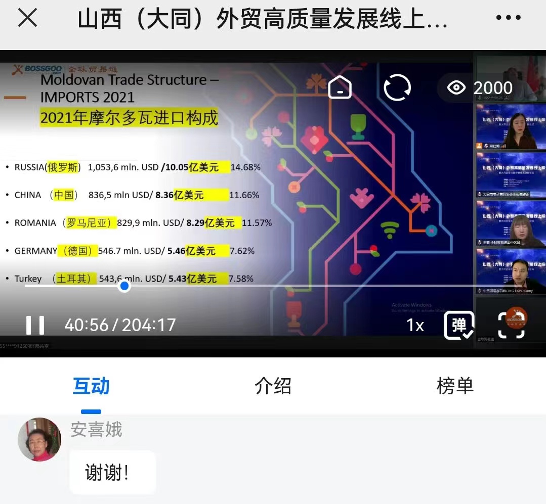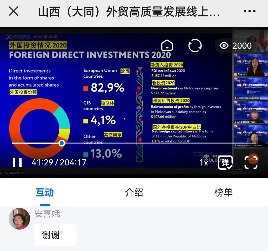 The Speaker is Mr. Dumitru BRAGHIS, the Ambassador of Moldova to China.During the presentation by H.E. Dumitru BRAGHIS, Ambassador of Moldova to China,We can see that the number of online meeting room has reached 2,000.